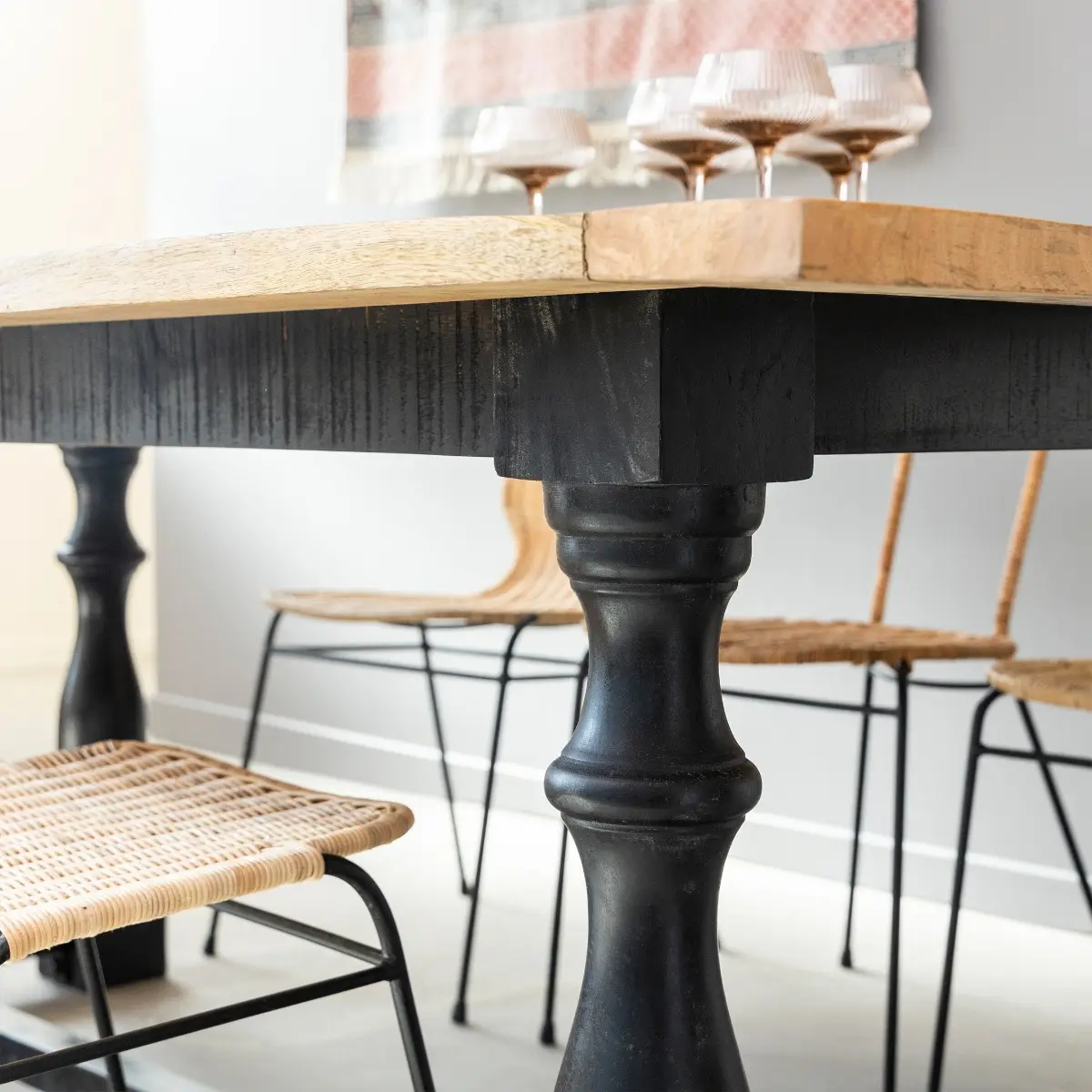 Offrez du caractère à votre salle à manger avec la table Sylvia, un meuble qui allie charme authentique et robustesse. Entièrement conçue en bois massif de manguier, elle séduit par son plateau aux nuances chaleureuses et son piètement noir sculpté au style industriel.