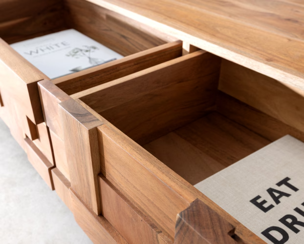 Table-basse Puzzle120 cm 4 tiroirs acacia naturel pied flottant métal noir