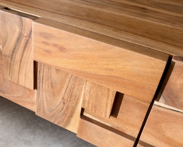 Ce compagnon de canapé de qualité marque des points avec une surface de rangement pratique et 4 tiroirs pour un intérieur moderne et bien rangé. Le design en puzzle réalisé à la main sur les façades des tiroirs crée un effet 3D captivant et attire tous les regards.