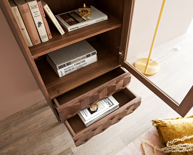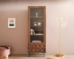 Fini dans un teint marron mat, le bois d’acacia aux grains fins dégage un effet noble.La vitrine étroite en bois d’acacia présente élégamment vos éléments décoratifs préférés derrière un verre fin.